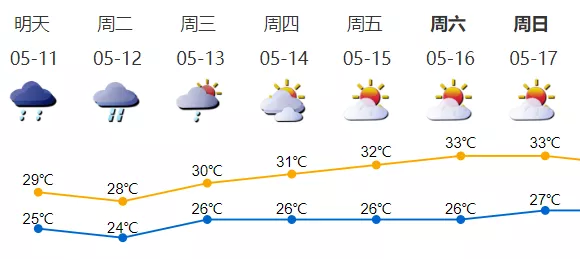 5月11日陰天,氣溫25-29℃,有陣雨或雷陣雨,伴有短時(shí)陣風(fēng)7級(jí)左右。12日有雷陣雨,局部大雨,局部有短時(shí)強(qiáng)降雨;13日陣雨轉(zhuǎn)多云;14-17日多云到晴天,天氣再趨悶熱。