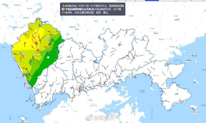 22時18分:過去1小時深圳市最大陣風(fēng)達到10-11級,出現(xiàn)在鹽田和大鵬南澳地區(qū)。