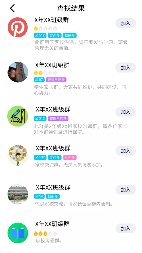 在QQ內(nèi)搜索“班級群”、“年級群”等關(guān)鍵字,即可檢索出大量的班級群聊。