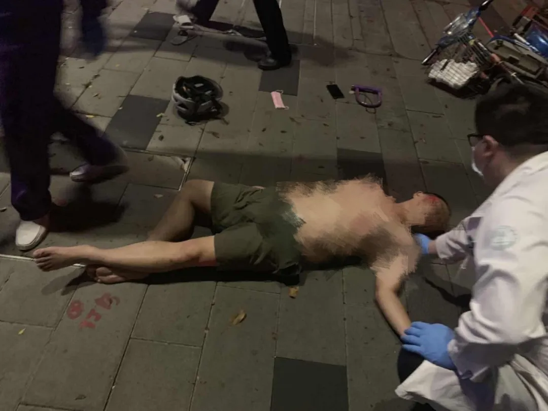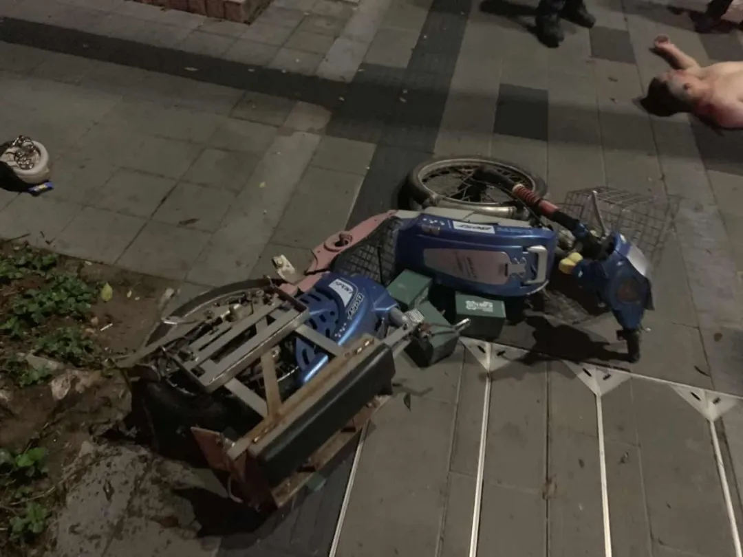 該男子上半身裸露橫躺在人行道上,而且臉上、身上多處擦傷,右眼淤青紅腫,旁邊還有一輛損壞的兩輪電動(dòng)車(chē),坐墊、鎖鏈、頭盔散落一地。