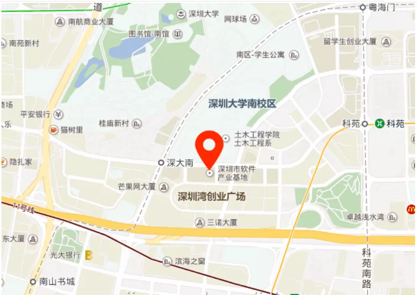 深圳市軟件產(chǎn)業(yè)基地,東接科技公園,西臨白石路,南靠濱海大道,北至學府路,中間科園路南北穿越。