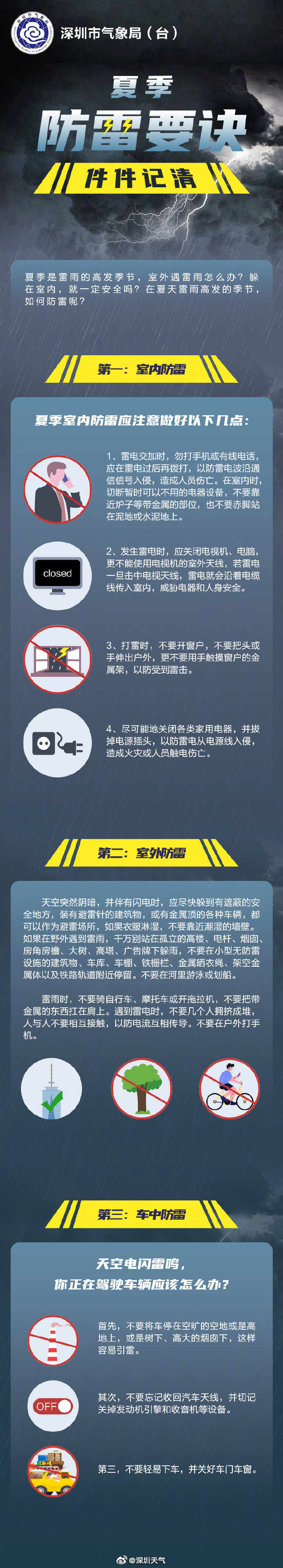 深圳市氣象臺于2020年06月05日11時(shí)15分在全市發(fā)布雷電預(yù)警,預(yù)計(jì)2小時(shí)內(nèi)全市將受雷電影響,市民停留在安全地方;按照防御預(yù)案停止戶外易燃易爆危險(xiǎn)作業(yè),并加強(qiáng)?;瘓鏊踩芾怼?/p>