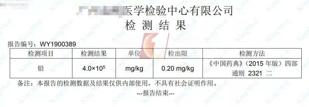 聽了醫(yī)生的建議,孩子家長將瓶子里的粉末拿到第三方檢測公司檢測。結果顯示,1克的藥粉里面,就含有大概0.4克的鉛!
