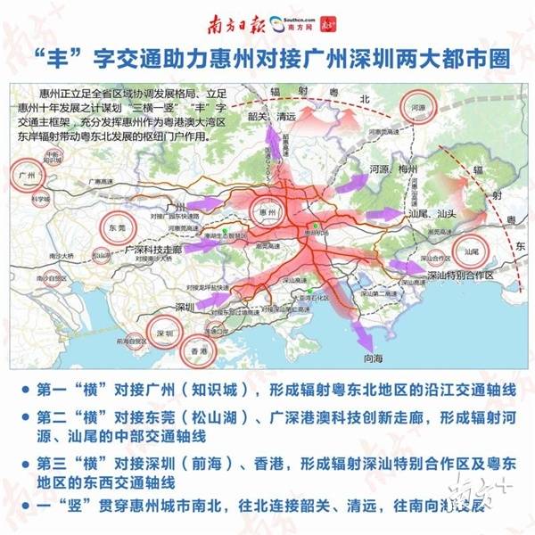 引人關(guān)注的是,惠州還大手筆啟動(dòng)實(shí)施“豐”字交通主框架,將打通內(nèi)聯(lián)全市7個(gè)縣區(qū)、外通廣深莞等6個(gè)城市、加速“融灣向?!钡狞S金通道,建設(shè)大灣區(qū)連接粵東、粵北以及閩贛地區(qū)的樞紐門戶。
