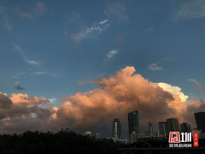下午19點(diǎn),夕陽將云朵染成橙色。