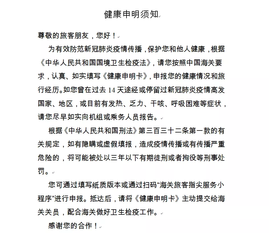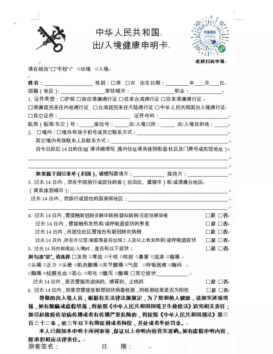 一、請?zhí)崆跋螺d打印《健康申明卡》(見附件1),或關注“海關旅客指尖服務小程序”(見附件2)。提前如實填寫紙質或電子健康申報信息,通關時主動向海關申報。