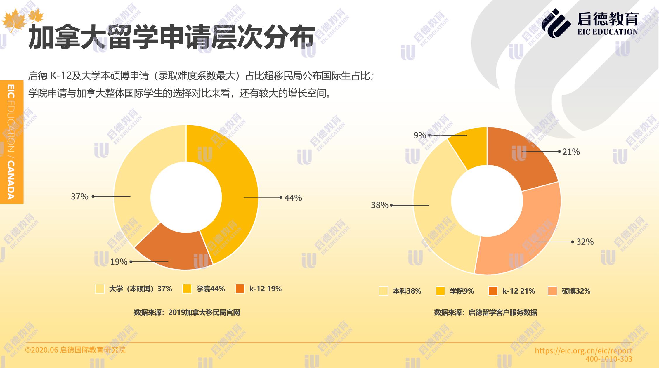 加拿大移民局官網(wǎng)2019年數(shù)據(jù)顯示,加拿大國際學(xué)生中 K-12階段申請占比為19%,大學(xué)(本、碩、博)申請占比37%,學(xué)院申請占比44%。啟德留學(xué)客戶服務(wù)數(shù)據(jù)顯示,2019年通過啟德申請加拿大留學(xué)的學(xué)生中,申請本科與碩博的學(xué)生占比分別為38%與32%,申請學(xué)院的占比為9 %,申請中學(xué)及其它的占比為21%,與加拿大移民局的官方數(shù)據(jù)對比來看,中國學(xué)生本科留學(xué)加拿大的占比較高,且在學(xué)院類申請中仍有不小的增長空間。