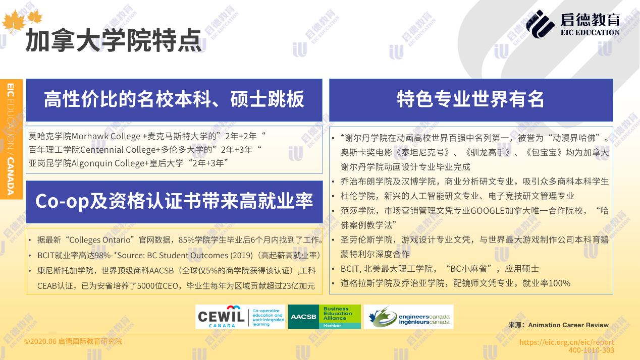 據(jù)最新“ Colleges Ontario”官網(wǎng)數(shù)據(jù),85 %的學(xué)院學(xué)生畢業(yè)后6個(gè)月內(nèi)找到了工作,91%的雇主對學(xué)生表示非常滿意。如康尼斯托加學(xué)院,擁有世界頂級商科 AACSB與工科 CEAB認(rèn)證,為安省培養(yǎng)了5000位 CEO,畢業(yè)生每年為區(qū)域貢獻(xiàn)超過23億加元。而奧斯卡獎(jiǎng)電影《泰坦尼克號》、《馴龍高手》、《包寶寶》均為加拿大謝爾丹學(xué)院動(dòng)畫設(shè)計(jì)專業(yè)畢業(yè)完成。北阿伯塔學(xué)院的納米技術(shù)專業(yè),杜倫學(xué)院的人工智能專業(yè),道格拉斯學(xué)院的配鏡師專業(yè),范莎學(xué)院的飛機(jī)維修專業(yè)也是世界有名的特色專業(yè)。