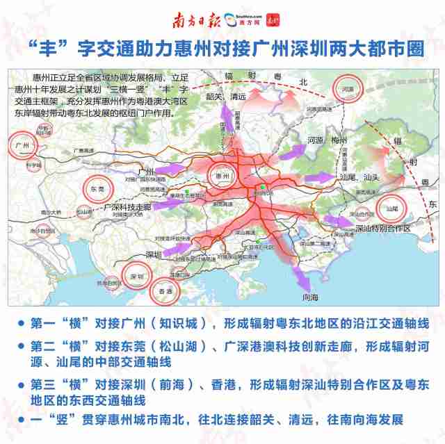 陳鴻宇舉例說,介于廣深兩大都市圈之間的惠州,大手筆規(guī)劃“豐”字交通主框架,向西分別對接廣州、東莞、深圳,向東輻射河源、汕尾等地,向北則連接韶關(guān)、清遠。類似這樣,各城市可緊密對接,推進更多跨城市、跨都市圈的合作。