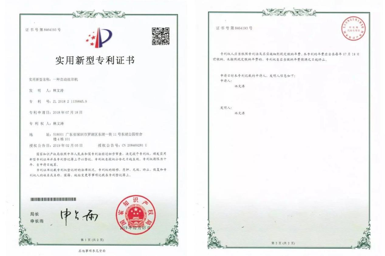 2019年12月,林文濤參加中國科協(xié)舉行的“全國青少年科技創(chuàng)新大賽”,獲得深圳市二等獎(jiǎng)。他發(fā)明的成品雨傘自動(dòng)絲印機(jī),榮獲實(shí)用新型專利證書。這種自動(dòng)絲印機(jī),極大地提高了工作效率,在一把雨傘上印刷一個(gè)logo僅僅需要單人5秒的時(shí)間。