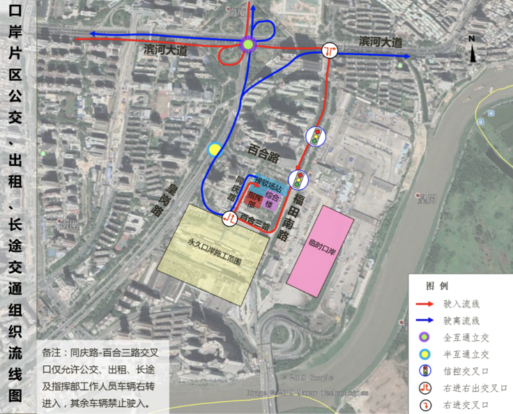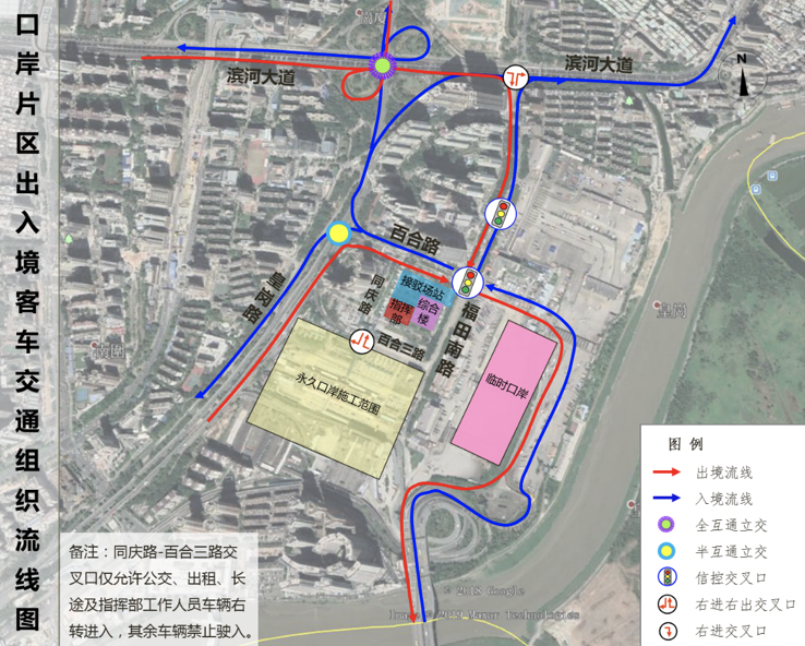 臨時(shí)口岸期間機(jī)動(dòng)車交通按照“流線順暢、客貨分離、人車分離”的原則進(jìn)行組織。主要利用口岸片區(qū)的皇崗路、百合路、福田南路、同慶路等進(jìn)行組織。各交通方式交通組織流線圖如下:
