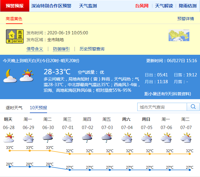 見圳客戶端?深圳新聞網(wǎng)2020年6月27日訊 根據(jù)深圳氣象局最新消息,深圳市27日17-20時,多云間晴天,局地有零星小雨;氣溫29-32℃;西南風(fēng)3-4級,沿海和高地最大陣風(fēng)6級;相對濕度65%-85%。