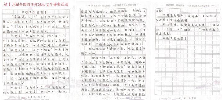 據(jù)活動組委會相關(guān)負(fù)責(zé)人介紹,“第十五屆全國青少年冰心文學(xué)盛典”以“2020文學(xué)之路,向上的力量”為主題,全程公益免費,設(shè)置了小學(xué)低年級組(1-3年級 )、小學(xué)高年級組(4-6年級 )、初中組、高中組、大學(xué)組、教師組、文學(xué)愛好者組等多個組別。值得注意的是,所有報名選手必須使用本次活動專用稿紙進(jìn)行書寫創(chuàng)作。組委會將會根據(jù)選手報名提交的郵寄地址免費郵寄活動專用稿紙,每人僅限領(lǐng)取5張。選手完成手寫作品以后,將作品掃描或拍照發(fā)送到全國青少年冰心文學(xué)寫作指導(dǎo)中心深圳組委會指定郵箱szbxwx@126.com(冰心文學(xué)深圳)或gdbxwx@126.com(冰心文學(xué)廣東)。