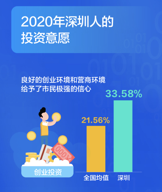 有了錢,深圳人會投資什么?大調(diào)查發(fā)現(xiàn),深圳人在創(chuàng)業(yè)投資的選擇占比高達33.58%,比全國平均水平要高出12個百分點,良好的創(chuàng)業(yè)環(huán)境和營商環(huán)境給予了市民極強的信心。從不同年齡段來看,創(chuàng)業(yè)投資意愿最高的是36-45歲的群體,不同行業(yè)中,服務(wù)業(yè)和金融業(yè)創(chuàng)業(yè)投資的意愿更高一些。
