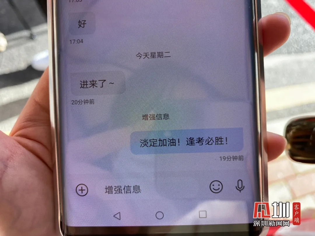 今早,在深圳中學送考現(xiàn)場,陳女士向記者展示給孩子發(fā)的高考加油短信:淡定,加油,逢考必勝。