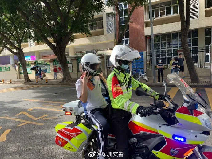 一考生遇早高峰擁堵,距離開(kāi)考還有十分鐘,@深圳福田交警鐵騎搭載考生順利到達(dá)考場(chǎng)。
