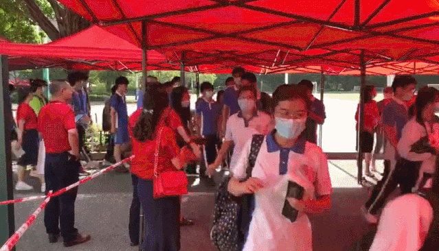 八點(diǎn)十分,學(xué)生走入考場,身穿紅色衣服的老師在兩側(cè)為考生送上祝福?!凹佑?!”“老師我們出發(fā)了。”祝福聲此起彼伏。