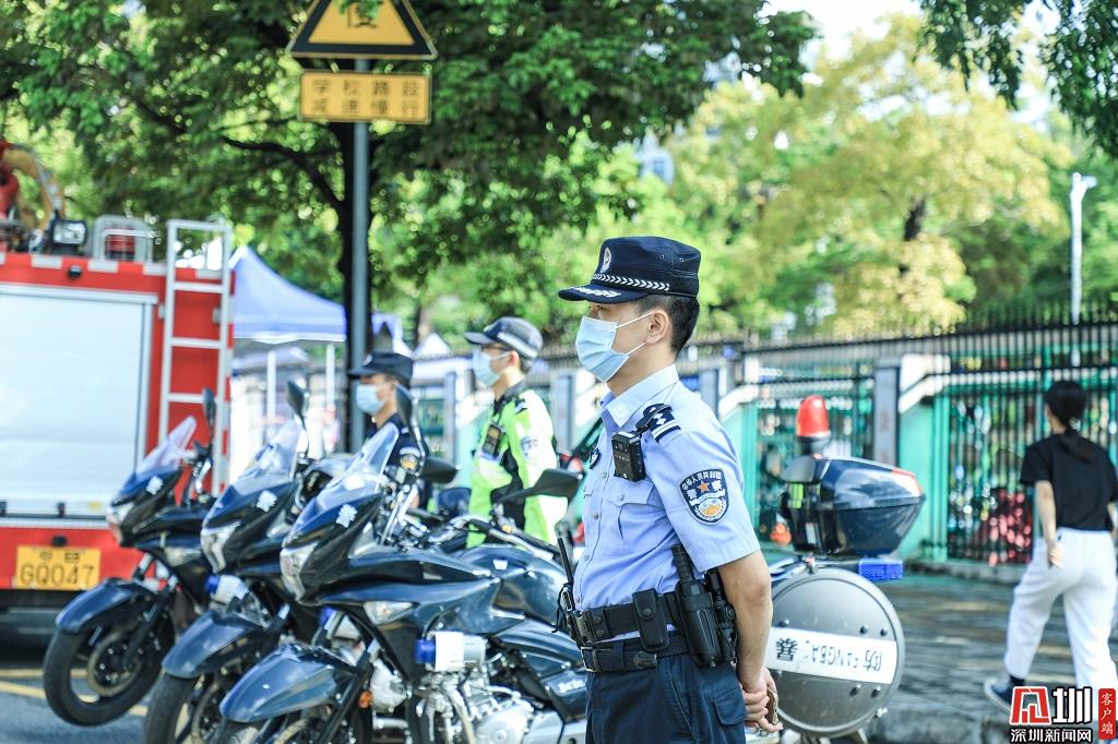 上午11時,深圳部分地區(qū)下起陣雨,交警在考點外了解現(xiàn)場情況。