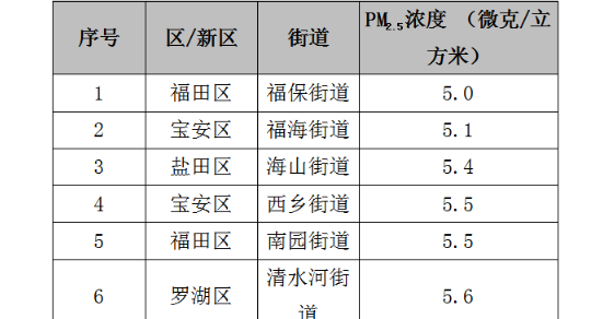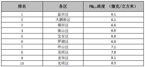 各區(qū)PM2.5平均濃度在6.1-8.3微克/立方米之間,濃度較低的有鹽田區(qū)、大鵬新區(qū)、福田區(qū)和南山區(qū),濃度較高的有光明區(qū)、龍華區(qū)和龍崗區(qū)。