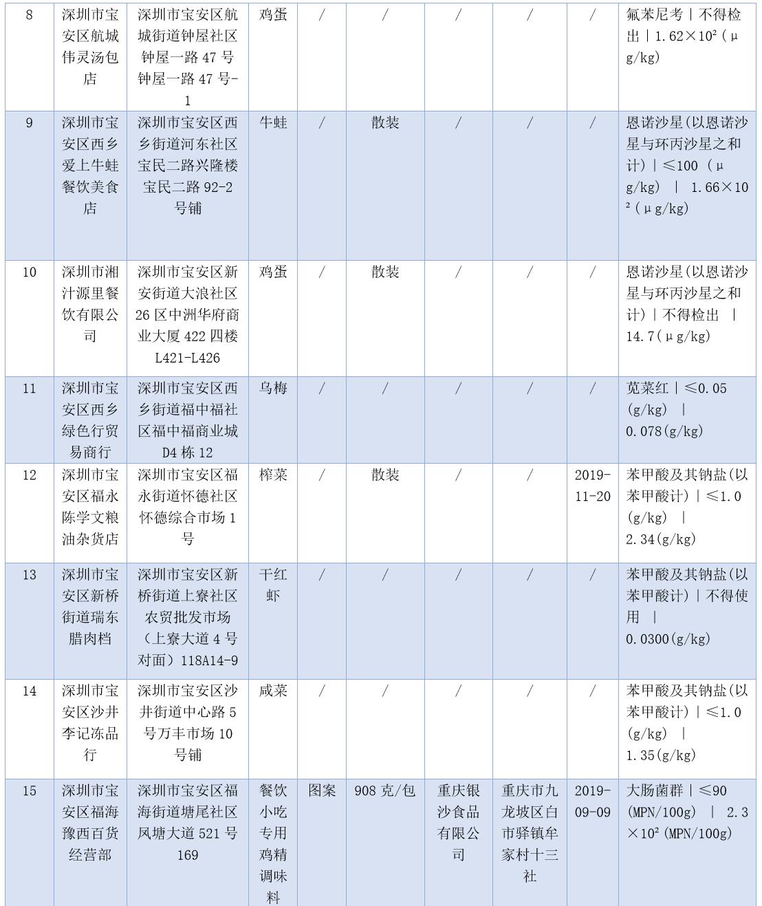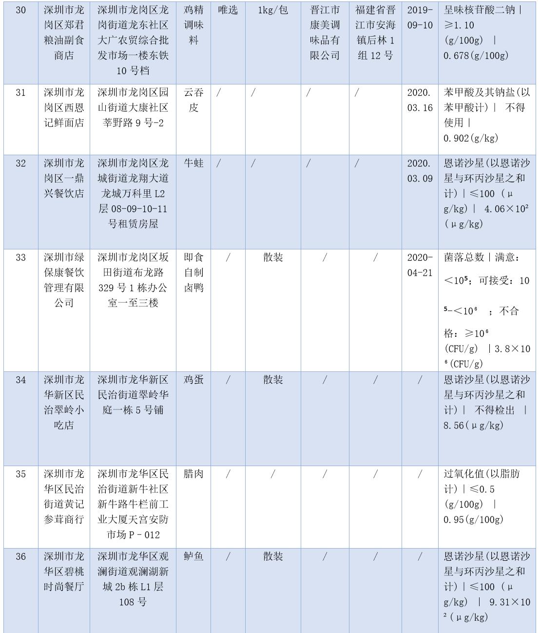 見圳客戶端·深圳新聞網(wǎng)2020年7月17日訊(晶報(bào)記者 鄧裴裴/制圖)7月17日,深圳市市場(chǎng)監(jiān)督管理局官網(wǎng)發(fā)布了2020年第二十二期食品安全抽樣檢驗(yàn)情況通報(bào),3-5月,共抽檢生產(chǎn)、流通、餐飲環(huán)節(jié)食品1229批次,發(fā)現(xiàn)不合格樣品47批次。記者注意到,不少不合格樣品抽檢單位為餐飲店,包括皇軒酒店、窯雞王、愛上牛蛙、御可奶茶等,還有些小吃店、腸粉店、螺獅粉店紛紛上榜。涉及不合格項(xiàng)目類別包括農(nóng)藥殘留、獸藥殘留、食品添加劑、微生物污染、品質(zhì)指標(biāo)、金屬等元素污染物。
