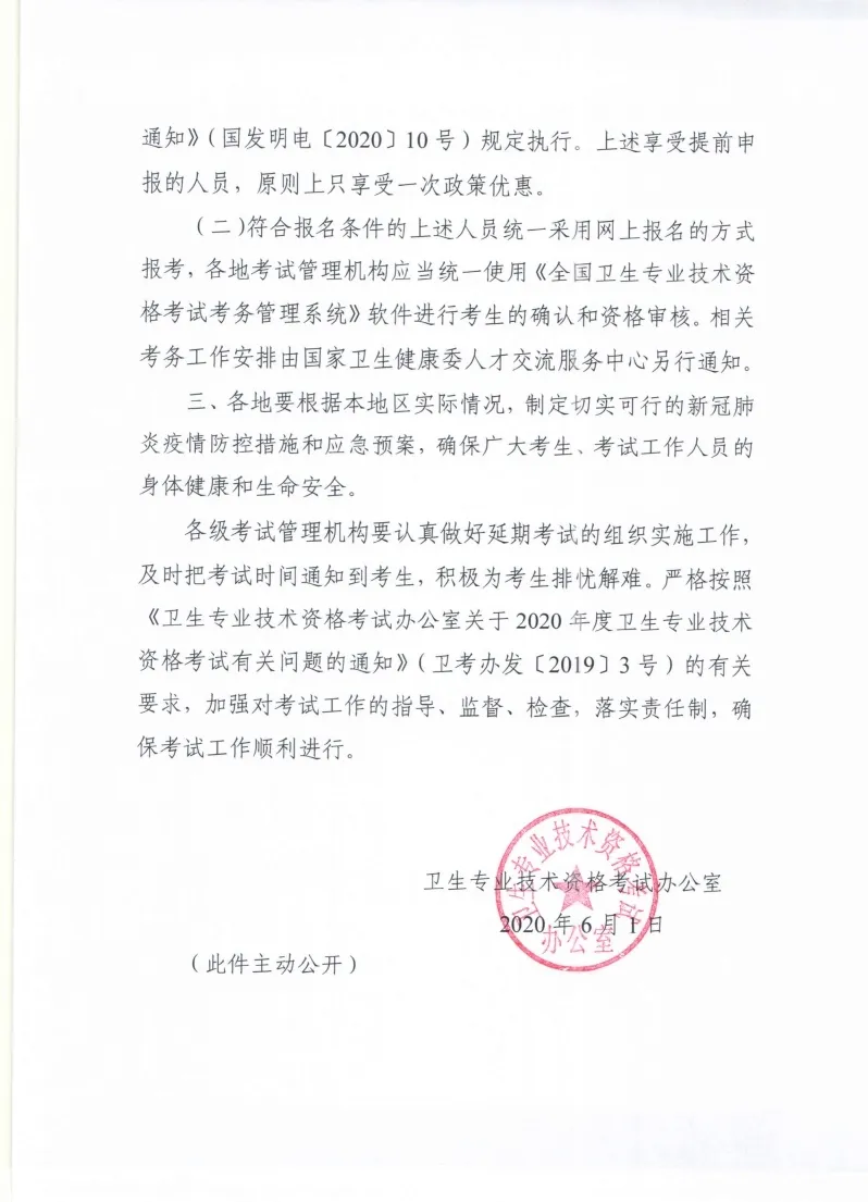 6月1日,衛(wèi)生專業(yè)技術資格考試辦公室印發(fā)《關于做好2020年度衛(wèi)生專業(yè)技術資格延期考試有關問題的通知》,2020年度衛(wèi)生專業(yè)技術資格考試延期至9月12、13、19、20、26、27日舉行。