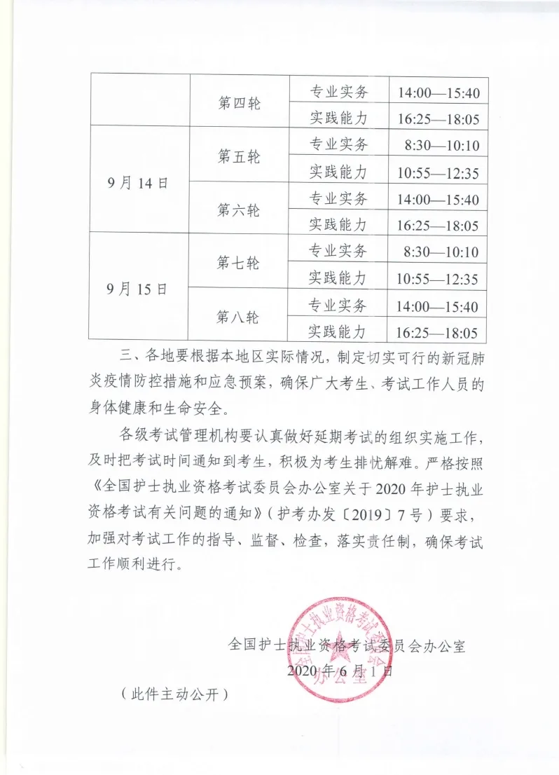 6月1日,全國護士執(zhí)業(yè)資格考試委員會辦公室印發(fā)《關于延期舉行2020年護士執(zhí)業(yè)資格考試的通知》,2020年護士執(zhí)業(yè)資格考試延期至9月12日—15日舉行。