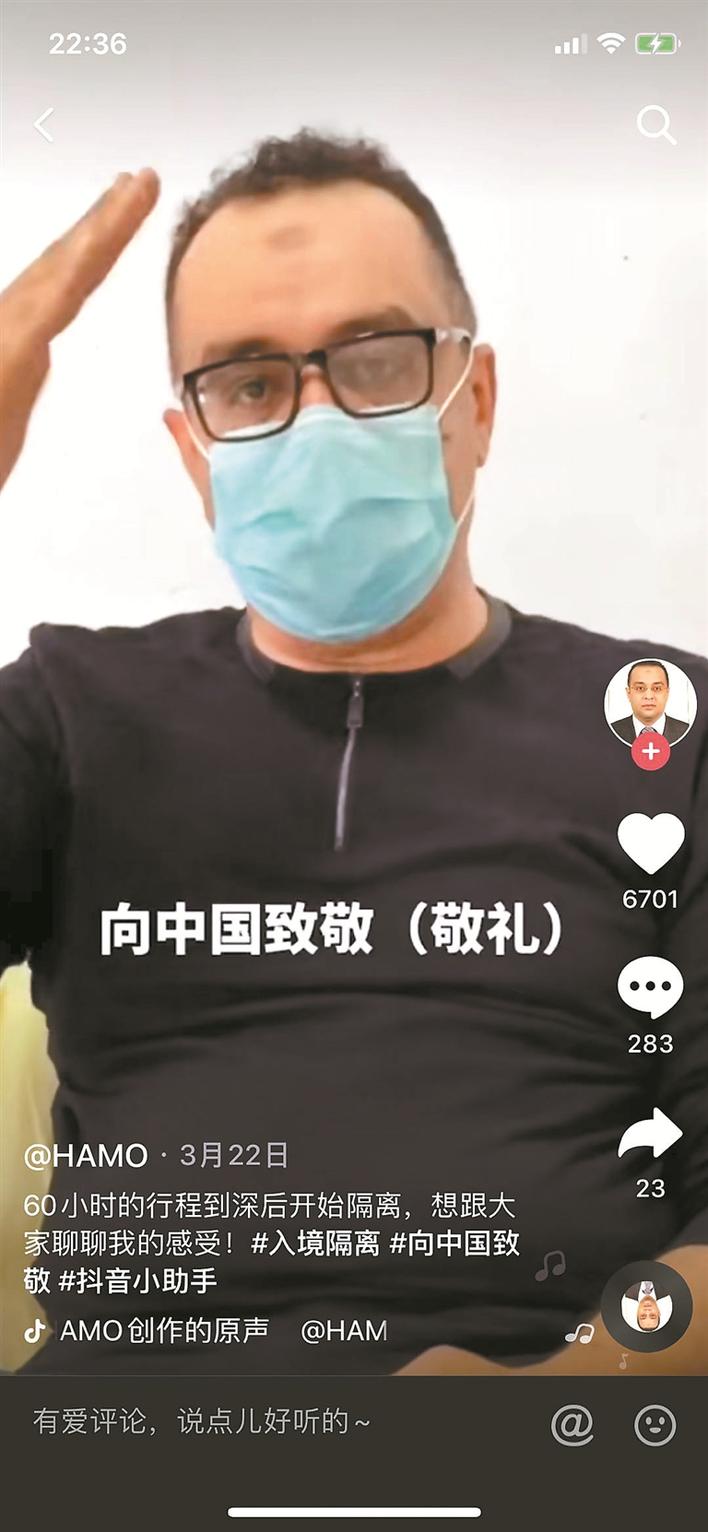而在另一邊,方哈默也自愿當(dāng)起了中國防疫宣傳大使,他用短視頻在抖音記錄了中國抗疫暖心舉措,向國內(nèi)外宣傳羅湖各項防疫措施,截至目前,他在抖音已收獲了2.4萬的點贊量。網(wǎng)友們紛紛留下了暖心的鼓勵“謝謝你的理解”“歡迎你來到中國”。“我先生是個比較開朗的人,也很喜歡中國的生活環(huán)境,喜歡中國人,我們周圍的鄰居、朋友對我們很好,沒有因為現(xiàn)在的疫情就歧視外國人或不敢靠近。所以他的心態(tài)一直都不錯?!狈焦奶嬖V記者,其實,對于她的丈夫來說,中國已經(jīng)是他的第二個家鄉(xiāng)。在疫情發(fā)生以來,他一直孜孜不倦地向所有朋友分享著中國政府在此次疫情中所做的努力和貢獻(xiàn)。