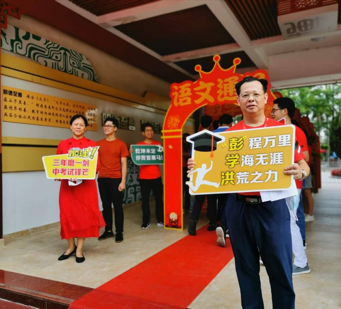 龍崗六約學(xué)校全體行政人員與九年級老師,穿著紅色送考服送考,寓意“鴻運當(dāng)頭”。九年級學(xué)生走過龍門,踏上紅地毯,自帶炫酷出場bgm。(記者李麗、周紅聲)