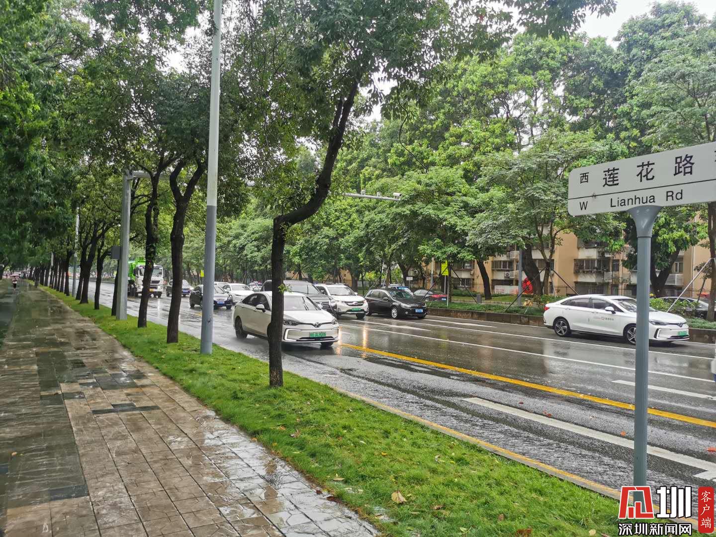 暴雨初歇,汽車行駛在蓮花路上。(記者張玲 攝)