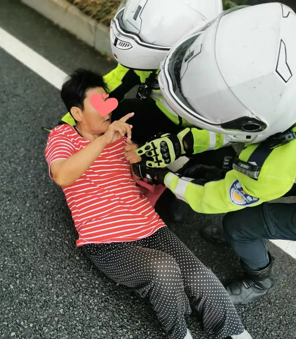 8月5日上午,深圳交警鐵騎巡邏至北環(huán)大道西往東方向珍珠嶺天橋路段輔道轉主道路口時,發(fā)現(xiàn)一位老太太躺在路中間。