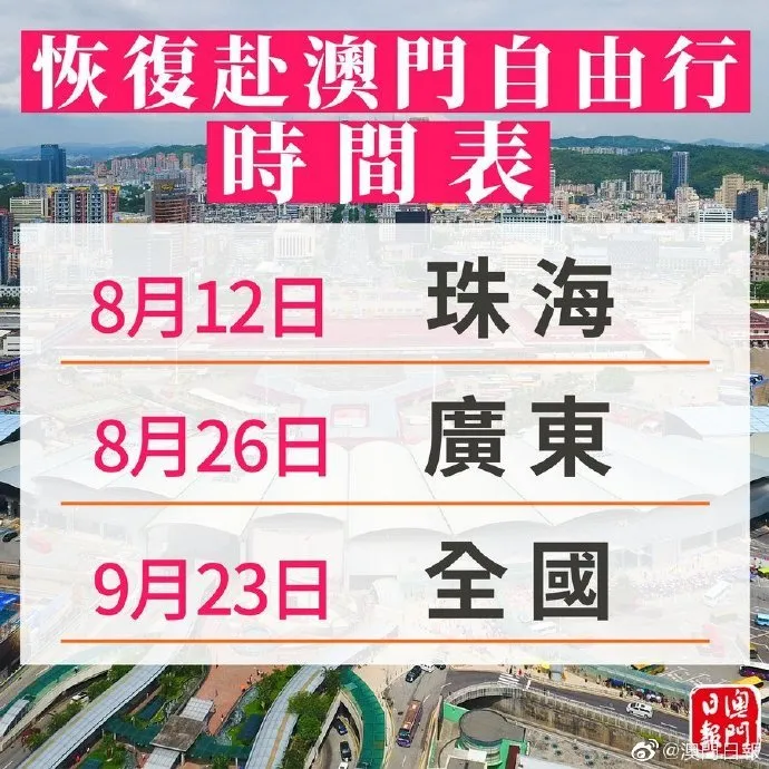 一、自8月12日起,廣東省珠海市公安機(jī)關(guān)出入境管理部門恢復(fù)辦理珠海市居民(含居住證持有人,下同)赴澳門旅游簽注;如無特殊情況,8月26日起,廣東省公安機(jī)關(guān)出入境管理部門恢復(fù)辦理廣東省居民赴澳門旅游簽注;在內(nèi)地與澳門疫情形勢繼續(xù)總體向好的前提下,全國公安機(jī)關(guān)出入境管理部門于9月23日起恢復(fù)辦理內(nèi)地居民赴澳門旅游簽注。
