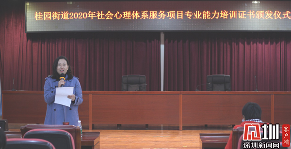 見圳客戶端·深圳新聞網(wǎng)12月17日訊(記者 郭含笑 通訊員 任倩囡)12月17日上午,中國心理衛(wèi)生協(xié)會(huì)理事、深圳市社會(huì)主義先行示范區(qū)專家、深圳市社會(huì)心理服務(wù)協(xié)會(huì)副會(huì)長張小梨,桂園街道辦事處副主任、公共服務(wù)辦公室主任林宣妤,桂園街道辦事處民生事務(wù)部部長王羽飛為66名通過考核的社會(huì)心理服務(wù)人員頒發(fā)證書。