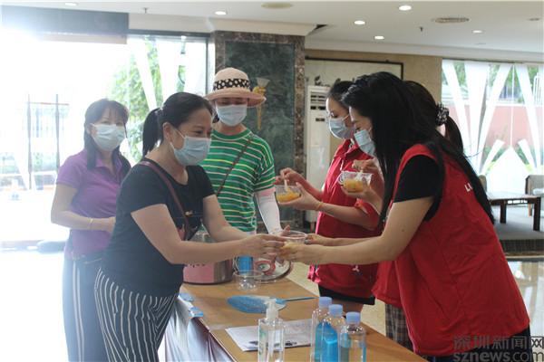 這兩鍋糖水可不一般,是居民賴秀文自掏腰包,買來蓮子、銀耳、木瓜,小火熬制了2個小時。當(dāng)天下午,值守在老圍花園C2出入口的義工楊文洪,是一位退伍軍人,前不久剛加入老圍社區(qū)義工隊,聽到疫情防控的召喚,利用休息時間來到小區(qū)出入口執(zhí)勤,協(xié)助居民進(jìn)行疫苗接種預(yù)約登記,忙得滿頭大汗也顧不上擦。他接過糖水,一口喝完,呵呵笑著說,“來得正是時候。”喝完,又忙著為進(jìn)門的居民驗健康碼。