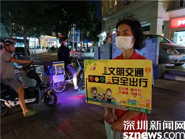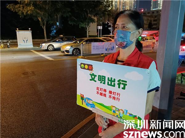另一位堅守在國慶假期里的義工是宣仲英,今年62歲。她一站兩個小時,始終是精神抖擻,毫不松懈??吹接腥嗽噲D闖紅燈,她及時制止??吹接腥瞬蛔甙唏R線,她立刻提醒。她手持勸導文明出行的牌子,就像個交通警察,誰也別想在她的面前犯規(guī)。本來下午6點鐘,正是她給家人做晚餐,同家人一起吃飯的時間,但她聽說社區(qū)創(chuàng)文需要人,就跟家人商量,得到了家人的一致同意。她說,“我從內(nèi)地來到深圳,在老圍社區(qū)住了10年,感覺深圳做義工的氛圍特別濃厚,我也想做義工,為社會發(fā)揮余熱?!?/span>