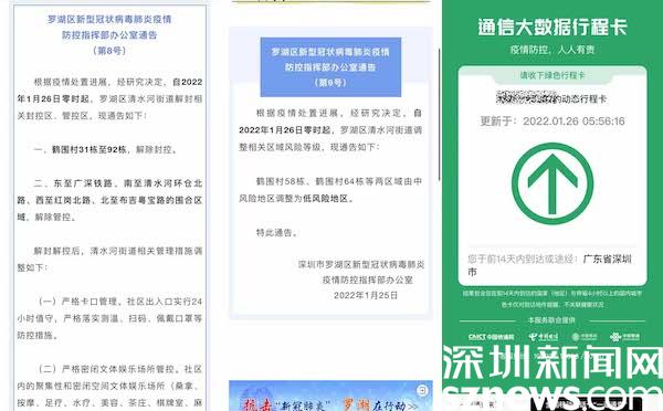 讀特客戶端·深圳新聞網(wǎng)1月26日訊(記者 覃鈺清)1月25晚,羅湖區(qū)新型冠狀病毒肺炎疫情防控指揮部辦公室發(fā)出通告,通告指出,自2022年1月26日零時起,羅湖區(qū)清水河街道解封相關(guān)封控區(qū)、管控區(qū),同時調(diào)整羅湖區(qū)清水河街道鶴圍村58棟、鶴圍村64棟等兩區(qū)域由中風(fēng)險地區(qū)調(diào)整為低風(fēng)險地區(qū)。調(diào)整后,深圳市全域均為低風(fēng)險地區(qū),不再執(zhí)行“持48小時核酸陰性證明離深”管控措施。
