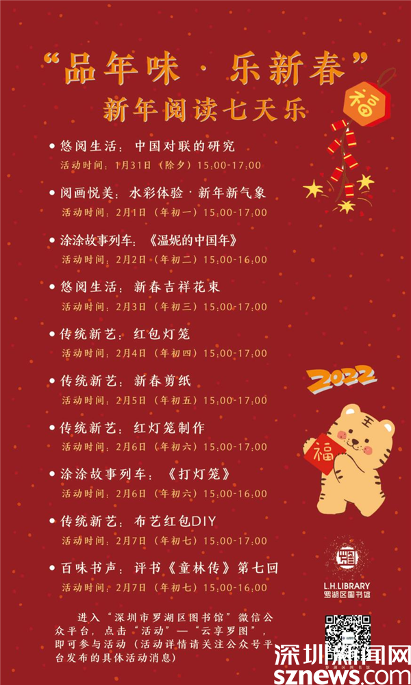讀特客戶端·深圳新聞網(wǎng)2022年1月28日訊(記者 劉嘉敏 通訊員 張蕾)壬寅年春節(jié)將至,為了營(yíng)造喜慶、歡樂、祥和的節(jié)日氛圍,羅湖區(qū)圖書館推出一系列豐富多彩的新春文化活動(dòng),讓留深讀者在新春佳節(jié)里盡享文化“大餐”。