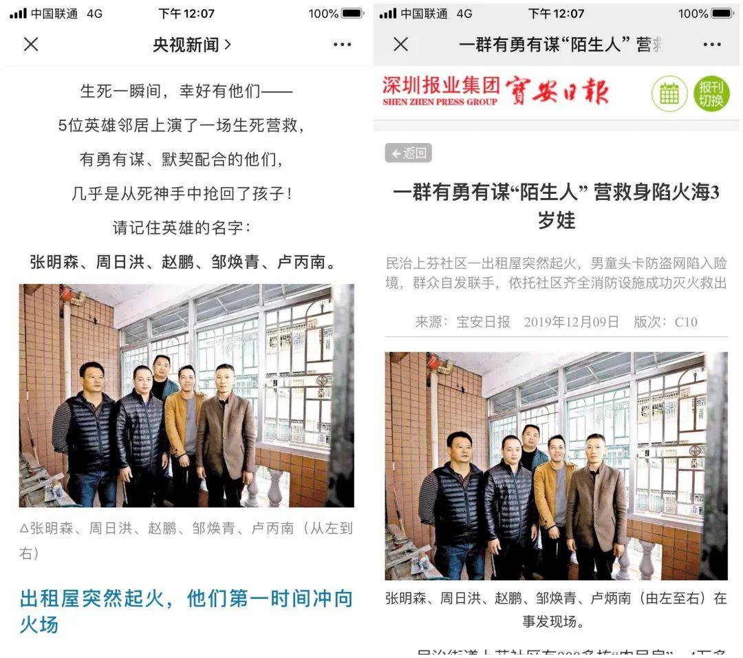 2019年12月3日,龍華區(qū)一處住宅突發(fā)大火,一名3歲幼童懸空在4樓的防盜網(wǎng)進(jìn)退不得。生死一瞬間,幸好有一群有勇有謀的“陌生人”,上演了一場(chǎng)生死營(yíng)救,合力救被困火場(chǎng)小孩(點(diǎn)擊回顧詳情)。