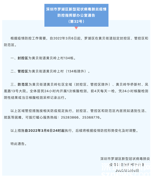 深圳市羅湖區(qū)新型冠狀病毒肺炎疫情防控指揮部辦公室發(fā)出通告,自即日起,在黃貝街道劃定封控區(qū)、管控區(qū)和防范區(qū)。