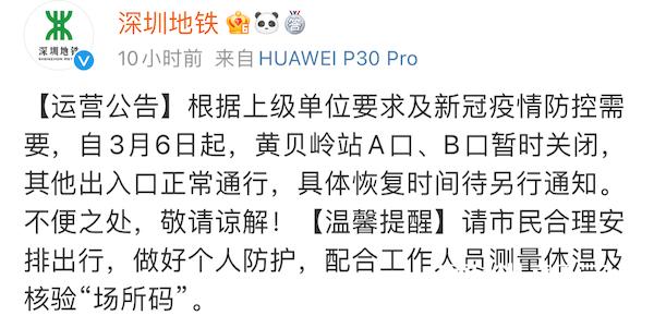 上午8時(shí),深圳地鐵發(fā)布運(yùn)營(yíng)公告:3月6日起,黃貝嶺站A口、B口暫時(shí)關(guān)閉,其他出入口正常通行。