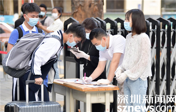 當(dāng)天早上,在羅湖高級(jí)中學(xué)校門口,學(xué)校老師、校醫(yī)、義工家長等早早來到校門口,迎接同學(xué)們的到來,每個(gè)同學(xué)都自覺戴好口罩,間隔一米距離,背著書包,拖著行李箱,進(jìn)入學(xué)校前出示校卡、粵康碼綠碼、行程卡以及24小時(shí)核酸陰性證明,并進(jìn)行衣物、行李、鞋底和手部消毒等。在經(jīng)歷了長達(dá)一個(gè)多月的線上課程后,同學(xué)們終于返回闊別已久的校園。突然開學(xué)是怎樣的心情?讓我們一起跟隨鏡頭直擊現(xiàn)場。