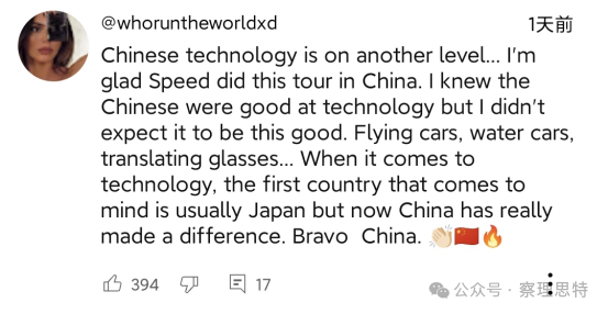 (中國的科技水平又上了一個臺階......我很高興Speed在中國舉辦了這次巡演。我知道中國人擅長科技,但我沒想到會這么好。飛行汽車、水上汽車、翻譯眼鏡......說到科技,首先想到的國家通常是日本,但現(xiàn)在中國真的做出了改變。中國萬歲!)