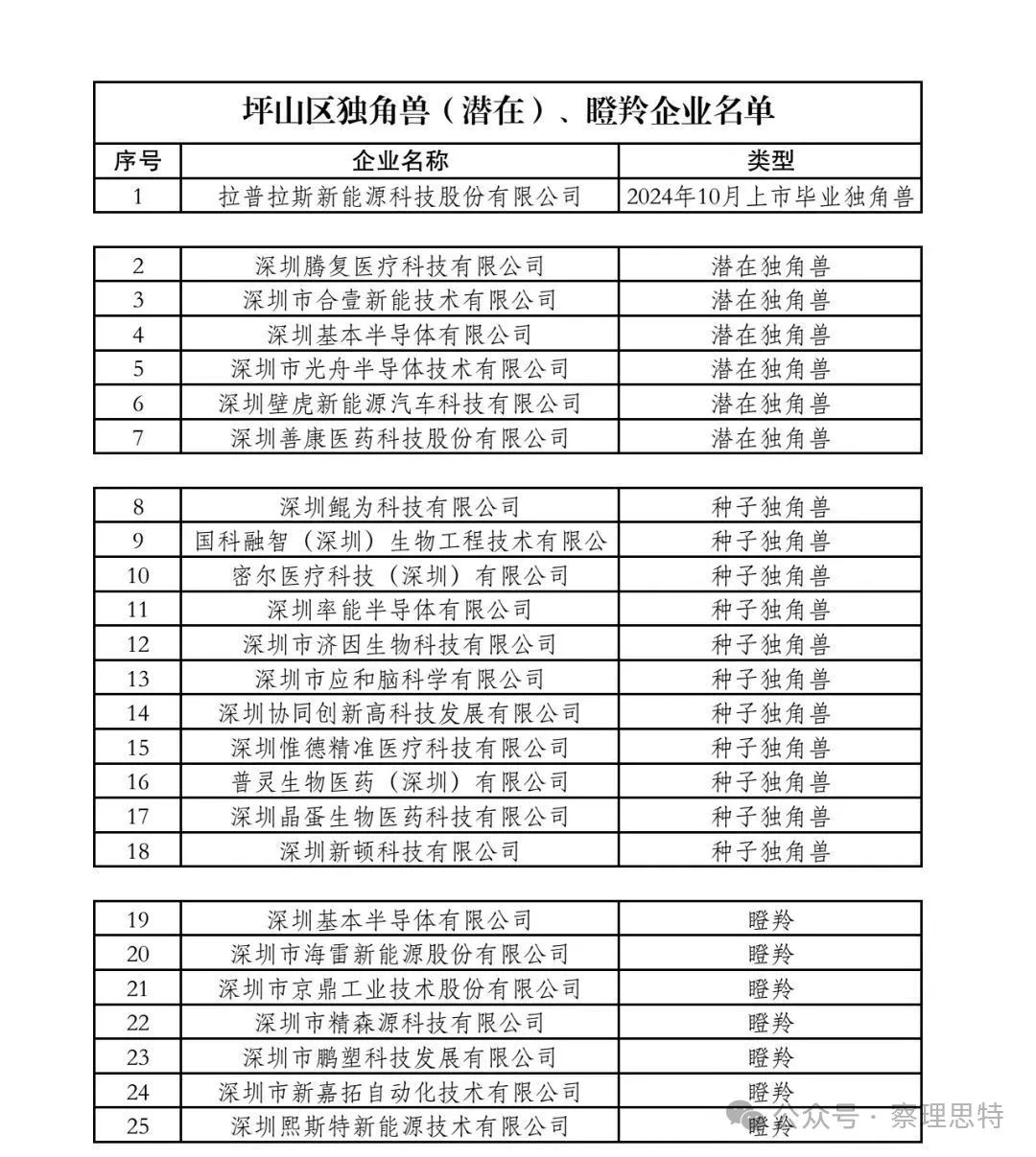 以坪山區(qū)為例,坪山區(qū)企業(yè)拉普拉斯入選全市新晉獨(dú)角獸企業(yè),也是其中3家上市畢業(yè)獨(dú)角獸企業(yè)之一。此外,坪山區(qū)有6家企業(yè)入選潛在獨(dú)角獸企業(yè),11家企業(yè)入選種子獨(dú)角獸企業(yè),7家企業(yè)入選瞪羚企業(yè)。盡管坪山只有一家企業(yè)入選全市新晉獨(dú)角獸企業(yè),但是從數(shù)據(jù)來看,坪山區(qū)潛在獨(dú)角獸企業(yè)、種子獨(dú)角獸企業(yè)和瞪羚企業(yè)很多,后勁和潛力之大可以期待。