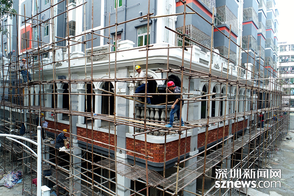 12月14日下午,水圍村改造的村民房的建筑鋼架還沒有拆除,建筑工人正在對外立面進行粉刷