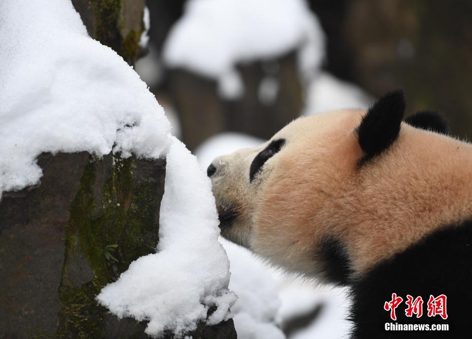 浙江杭州大熊貓雪地里活動進食憨萌可掬