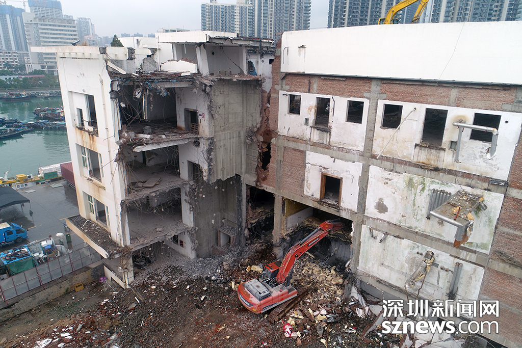 從高空俯瞰,漁人碼頭水產(chǎn)交易市場(chǎng)和制冰廠房屋的房屋拆除速度非常快,不少拆除機(jī)器正在工作