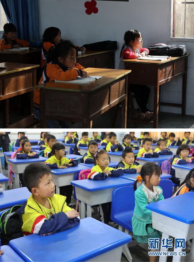 拼版照片:上圖為7歲的李曉彤(右一)在華山小學(xué)教室內(nèi)晨讀(4月27日攝);下圖為7歲的李曉彤(前排左二)在黔西縣第十小學(xué)教室內(nèi)上課(5月7日攝)。貴州省黔西縣金蘭鎮(zhèn)瓦房村哈沖組位于六沖河岸邊的崖壁下,哈沖組的孩子們每天要往返崖壁上的山路才能到達(dá)華山小學(xué)就讀。28年來(lái),崖壁上約4公里山路成了當(dāng)?shù)孛缱鍖W(xué)生艱難危險(xiǎn)的求學(xué)路。 5月5日起,哈沖組里的苗族同胞陸續(xù)通過(guò)易地扶貧搬遷至縣城的錦繡花都安置點(diǎn),孩子們也陸續(xù)搬至黔西縣第十小學(xué)就讀。自此,孩子們的上學(xué)路從約2個(gè)小時(shí)艱難跋涉的崖壁山路變?yōu)椴叫兄恍枰胄r(shí)的公路。求學(xué)之路“天塹變通途”,哈沖組村民幾代人的崖壁求學(xué)路成為歷史。新華社記者歐東衢攝