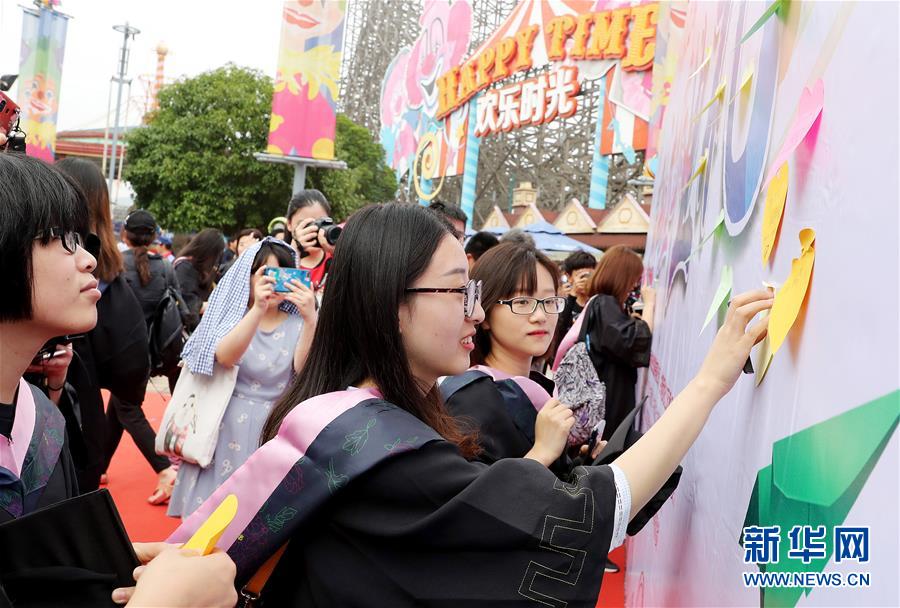 6月10日,畢業(yè)生們將寫著自己畢業(yè)愿望的貼紙貼到留言墻上?!⌒氯A社記者 方喆攝