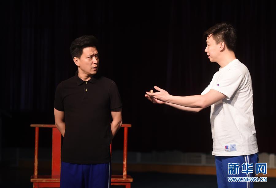 6月19日,扮演宋子文的張建峰(左)和扮演張?zhí)椎淖T正巖(右)在排練中。新華社記者 羅曉光 攝