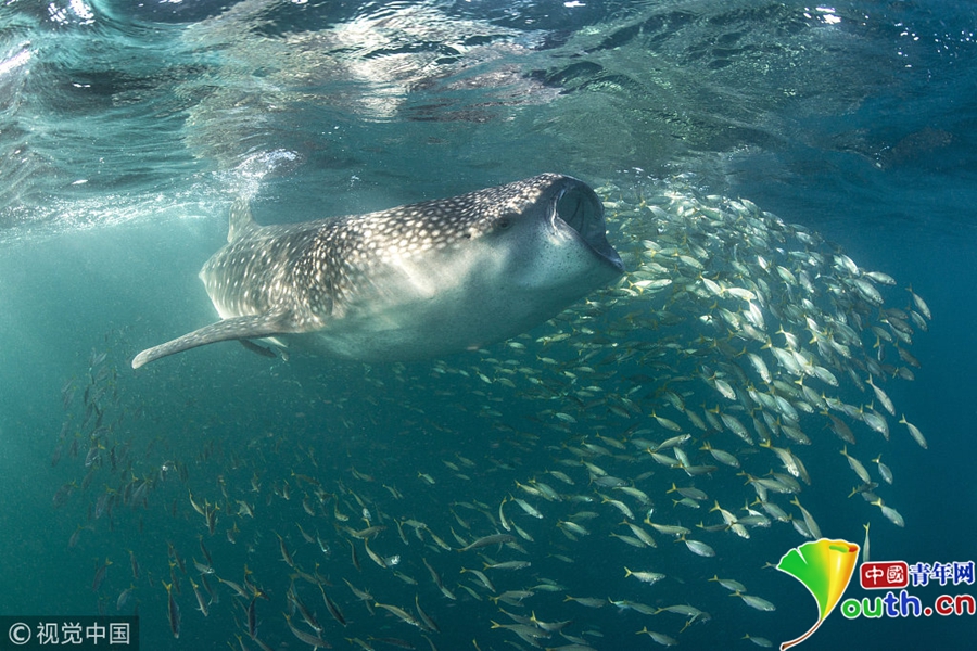 2018年3月30日訊(具體拍攝時間不詳),非洲,一只鯨鯊張開大嘴試圖吞下似龍卷風盤旋著的浮游生物群。