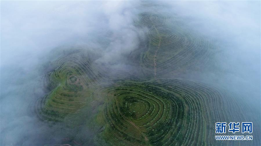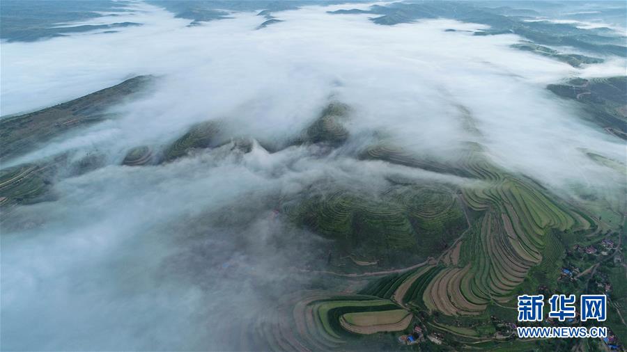 云霧繚繞的寧夏彭陽縣金雞坪梯田公園(7月17日攝)。新華社記者 王鵬 攝